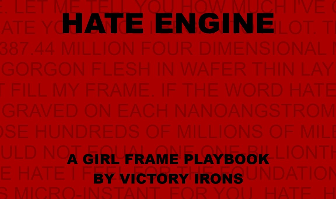 HATE ENGINE is a Frame playbook for Isabelle M. Ruebsaat's Girl Frame about turning into a hammer in a world of nails. Give into the HATE, and you'll be powerful, invincible, untouchable. They call it unpredictable, volatile, and insubordinate - but who cares? If they want to get in your way, they can pay the price.
