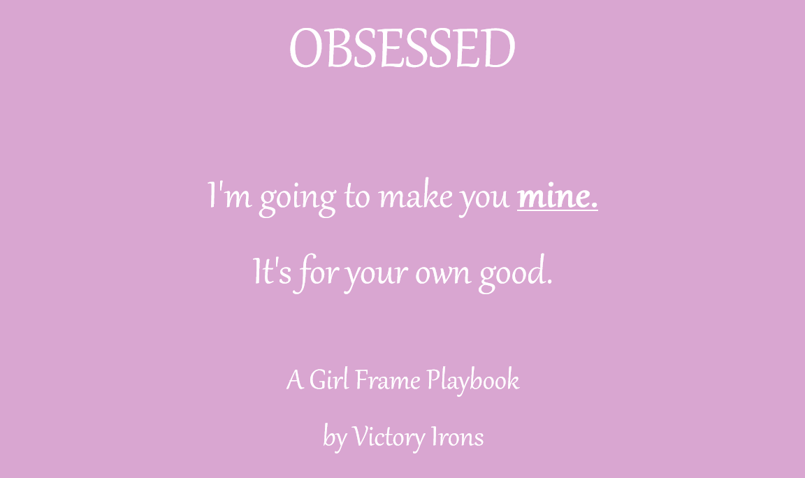 Obsessed is a Handler playbook for Isabelle M. Ruebsaat's Girl Frame about love, and all the ways it turns ugly when you have unilateral power over the object of your affections. Whether you see her as a real woman, a decoration, or something in between - even your best intentioned efforts will cause her pain.